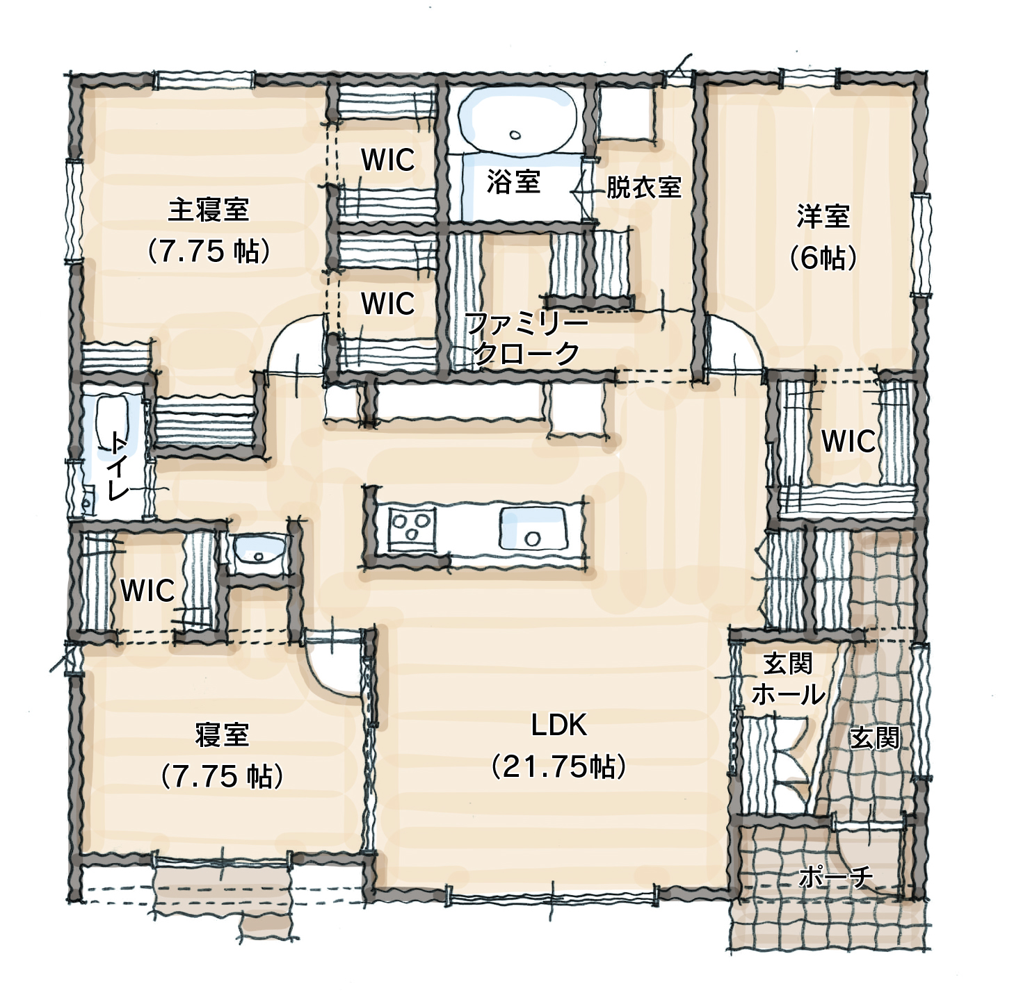 • 生活感を隠すキッチン動線。バックヤードから脱衣・物干しスペースに一直線。